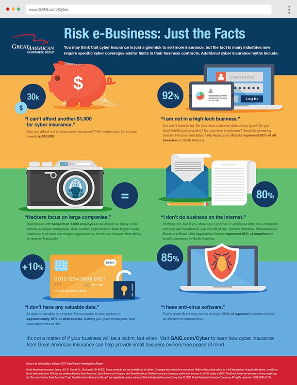Get to know our Cyber Risk division! Our Risk e-Business products feature two principal Insuring Agreements (Loss Expense and Liability Expense Coverage) plus a streamlined form with very few exclusions. It's cyber coverage made simple. Download this infographic to help illustrate why your clients may need cyber coverage, and contact our underwriting team today to learn more!