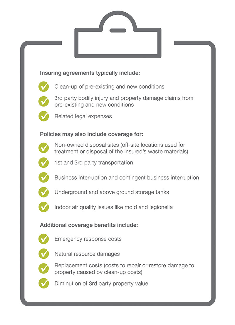 The ultimate structure of coverage will depend on the technical information available for underwriting, including in particular the findings of available environmental due diligence. While an underwriter would not require the insured to conduct due diligence for the purpose of obtaining environmental insurance, any recent and detailed environmental information allows the underwriter to craft bespoke coverage for each insured around the conditions of the site. Other valuable information needed for underwriting includes future renovation or development plans (if applicable), property condition assessment reports, and details regarding the insured’s environmental management and control of the site.