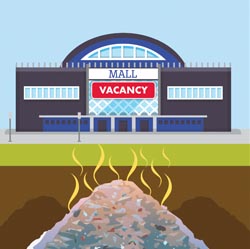 If a mall has been vacant for a longer period of time with the HVAC system turned off, significant mold growth can occur in the structure. Mold grows quickly in carpeted surfaces, fountains, ceiling tiles, and other organic interior surfaces. Prior to demolition or other re-use, this mold must be managed. Other damage to the mall structure and exterior can be caused by vandals, copper thieves, and vagrants. Any sub-basements, pits, or sumps may have water that must be managed/treated prior to disposal. During demolition, any oil/grease traps, cisterns, dry wells, etc. must be investigated to ensure that no environmental conditions are present. If a mall is abandoned for a significant period of time and not properly maintained, substantial structural damage in the way of rust, water infiltration, ruined wall coverings, etc., may impede the inspection and damaged materials removal. Much of this damaged material will require landfill disposal, as water damage makes many building materials unrecyclable. In summary, malls can quickly go from valuable real estate space to a toxic nightmare, requiring extensive and expensive environmental management.