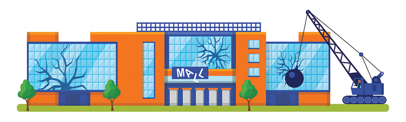 In the late 1950s, construction of indoor shopping malls began, and construction continued to escalate through the 1960s, 1970s, and 1980s. Since, construction of malls has significantly declined with the last indoor mall in the U.S. built in 2007. (2) The Atlantic Magazine estimated that of the approximate 1,200 malls in the U.S., one third are “dead or dying”. These malls, which were once thriving economic and social centers, have recently fallen on hard times with many failing, while a significant number of others are closing or being demolished. Many failed or failing malls may lay largely vacant, and ultimately face demolition and subsequent redevelopment. The redeveloped shopping centers are often transformed into warehouses, industrial parks, multi-family residential properties, or repurposed for some other different retail/business use. Some mall redevelopment projects include: