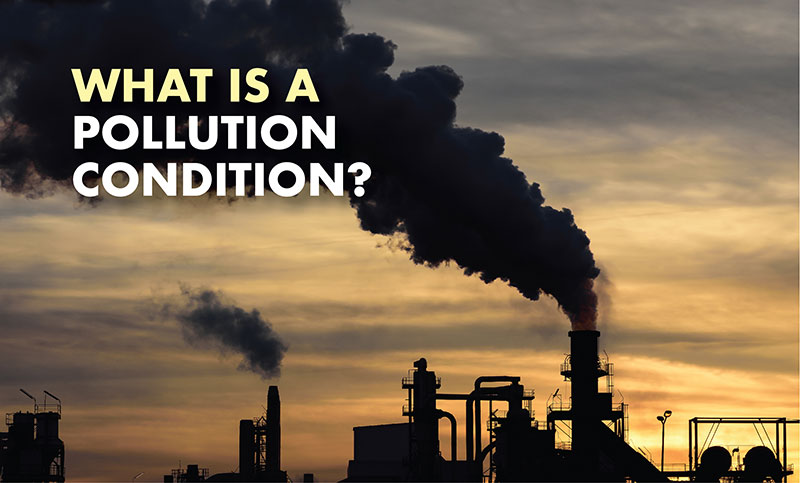 A pollution condition includes the discharge, dispersal, release, seepage, migration or escape of pollutants into the environment. Pollutant is typically defined to include any: solid, liquid, gaseous, or thermal pollutant, irritant, or contaminant, including but not limited to smoke, vapors, odors, soot, fumes, acids, alkalis, toxic chemicals, hazardous substances, petroleum hydrocarbons, waste, including medical, infectious, red bag, and pathological wastes, legionella, electromagnetic fields, mold matter and low-level radioactive waste and material. This typically includes the release or discharge of contaminants into the ground or atmosphere, although a pollution condition may also include the illicit abandonment of pollutants at a covered location by a 3rd party, and even chemicals associated with meth labs.
