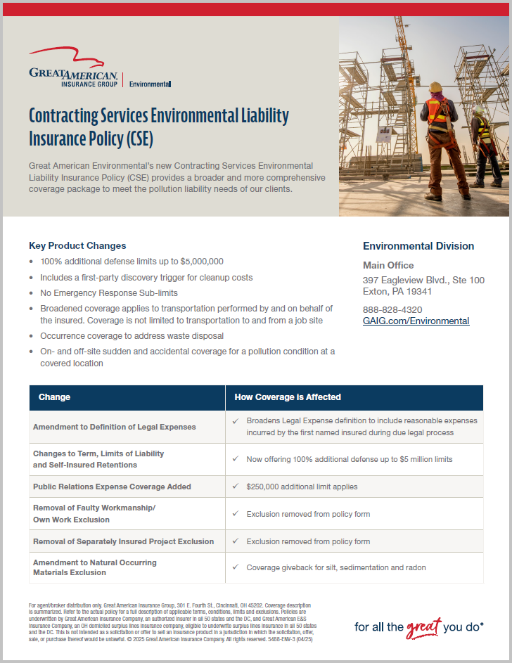 Great American Environmental has updated its Contracting Services Environmental Liability Insurance Policy (CSE)! This policy covers bodily injury, property damage, legal expenses and clean-up costs resulting from pollution conditions associated with Contracting Services. It also provides coverage for liability associated with Non-Owned Disposal Sites, Transportation of the insured's products or wastes and Owned Locations.