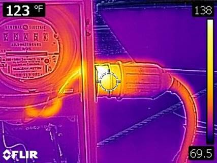 Recently, Great American helped a marina owner detect an issue. During the meeting, a loss prevention consultant scanned an electrical pedestal and shore power cord. To the naked eye, there appeared to be nothing wrong. However, with the FLIR camera, you can see the elevated temperature inside the connection.
