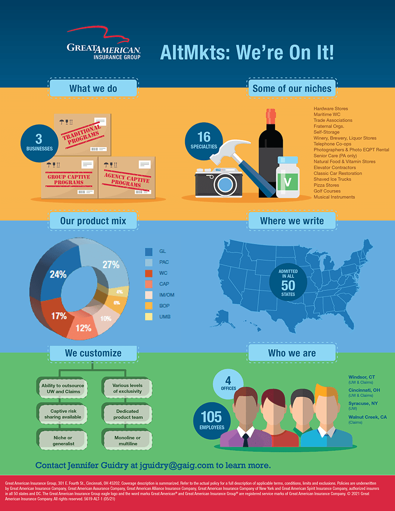 Get to know our Alternative Markets division! We offer specialty coverage to niche markets through both traditional and risk-sharing options. With five offices across the country and a wide mix of business lines, we can customize programs for you. Find full details on our website or contact Jennifer Guidry or Anita Scott. See a visual representation of our Alternative Markets division below!